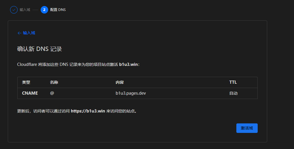 点击“激活域”之后,等待 DNS 检查完成,检查步骤不是立即完成,而是需要一定时间才能生效,如果你在其他服务商那里设置的域名 DNS 设置,可能时间会更长一点,请耐心等待。
