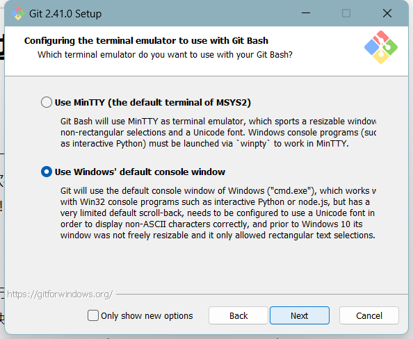 继续。需要指出的是 Win 10 开始,CMD 已经大有改观,现在可以考虑选择第二个选项,网上许多说 MinTTY 比 CMD 好用的文章大部分还是老 CMD 时代写的,那会的 CMD 窗口不支持拷贝粘贴,翻页查看历史记录也非常有限,体验非常差劲,所以那时候推荐的是 MinTTY,而现在这些功能都可以在 CMD 上使用,更何况现在的它还有多标签页等功能。