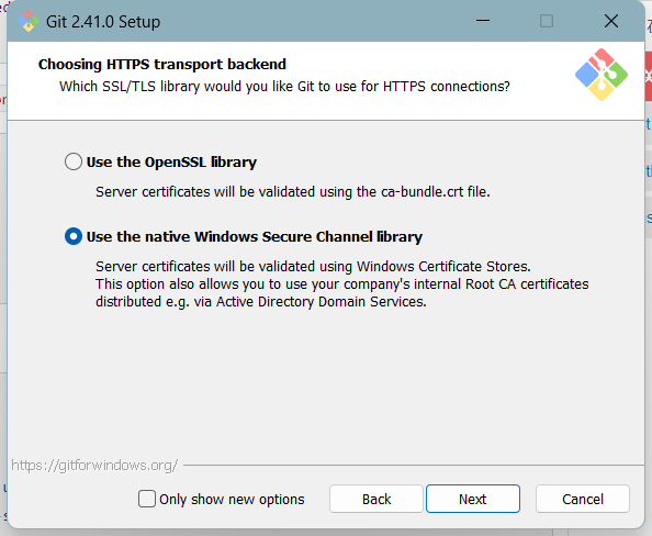 继续。请选择第二个选项,这样一来,Git 将会从 Windows 凭据管理器中读取凭据,除非你熟悉 OpenSSL,否则推荐使用 Windows 凭据管理器。