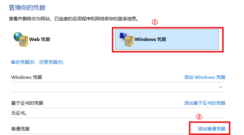 或沿控制面板——用户账户——凭据管理器打开,在凭据管理器界面选中找到普通凭据,点击添加普通凭据。