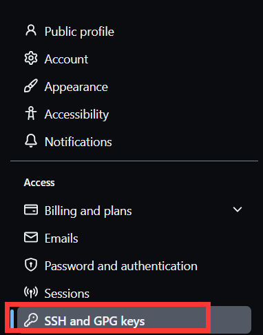 在左侧边栏中选择 SSH and GPG keys 选项。