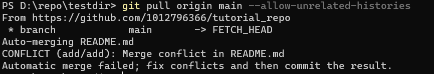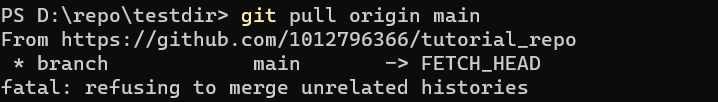 根据描述,我们在 git pull 时,由于远端仓库和本地仓库均有不同的提交(尽管远端和本地都有创建 README.md 的历史,但是两者创建的时间和内容均不一样),导致 Git 认为是两个仓库是独立不同的版本,拒绝合并,我们可以通过