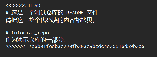 在 <<<<<<< HEAD 和 ======= 之间的是我们本地的内容,而在 >>>>>>> 7b6b01fedb3c220fb303c9bcdc4e35516d59b3a9 和 ======= 之间的是远端仓库的内容。