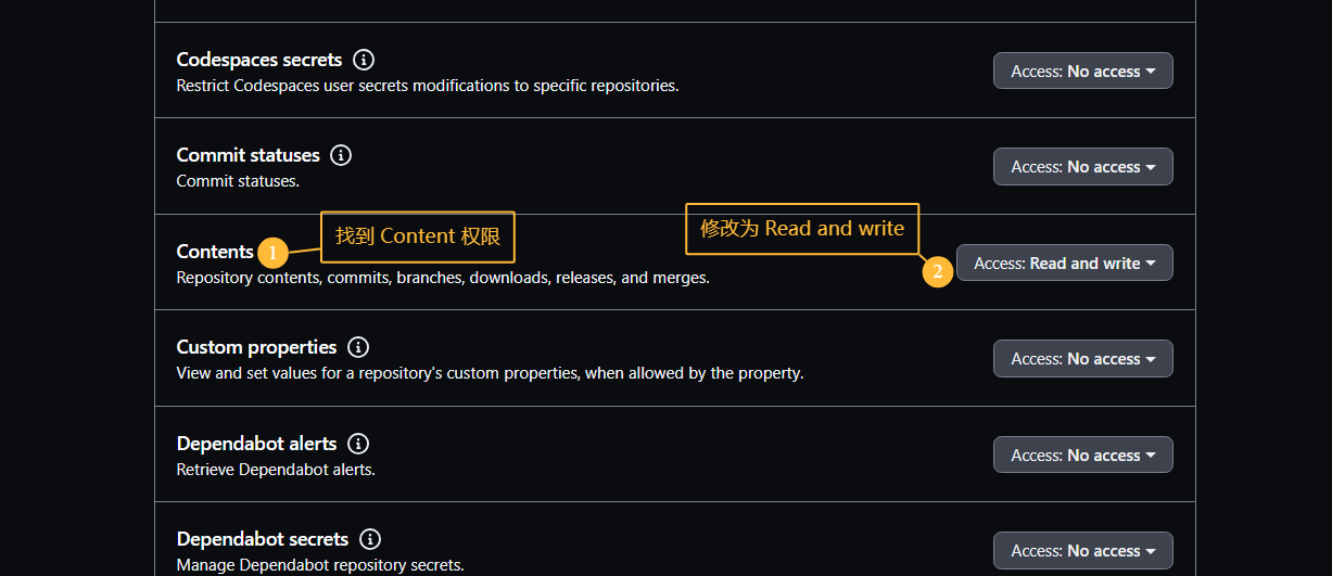 访问范围包括仓库文件等等,要想推送文件更改,需要获得此权限,我们只需要将该设定修改为 Read and write 即可。
