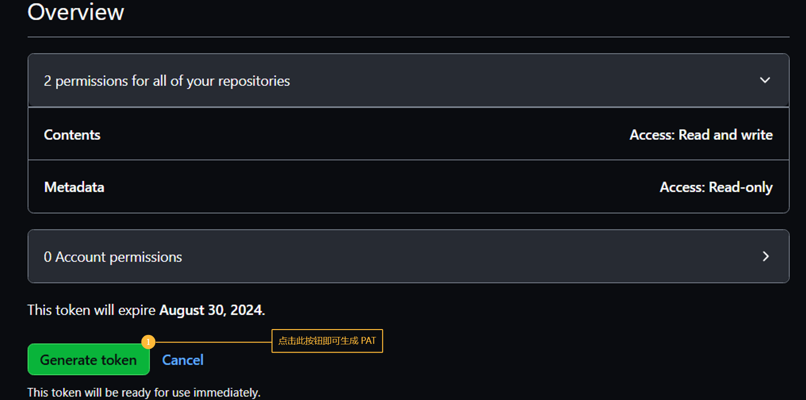 选择完你所需要的权限后,滚动到页面最底下,可以找到 Generate token 按钮。