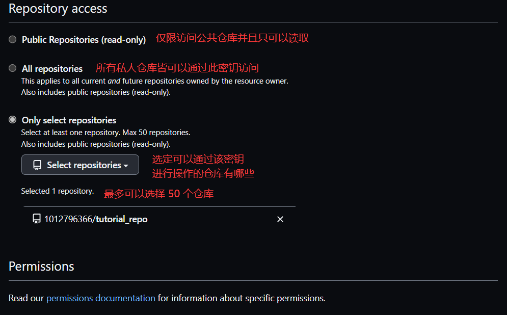 通过该密钥,只可以访问你限定的仓库(显然,必须是已经创建的仓库),并且拥有所分配到的权限。最多可以分配 50 个仓库。